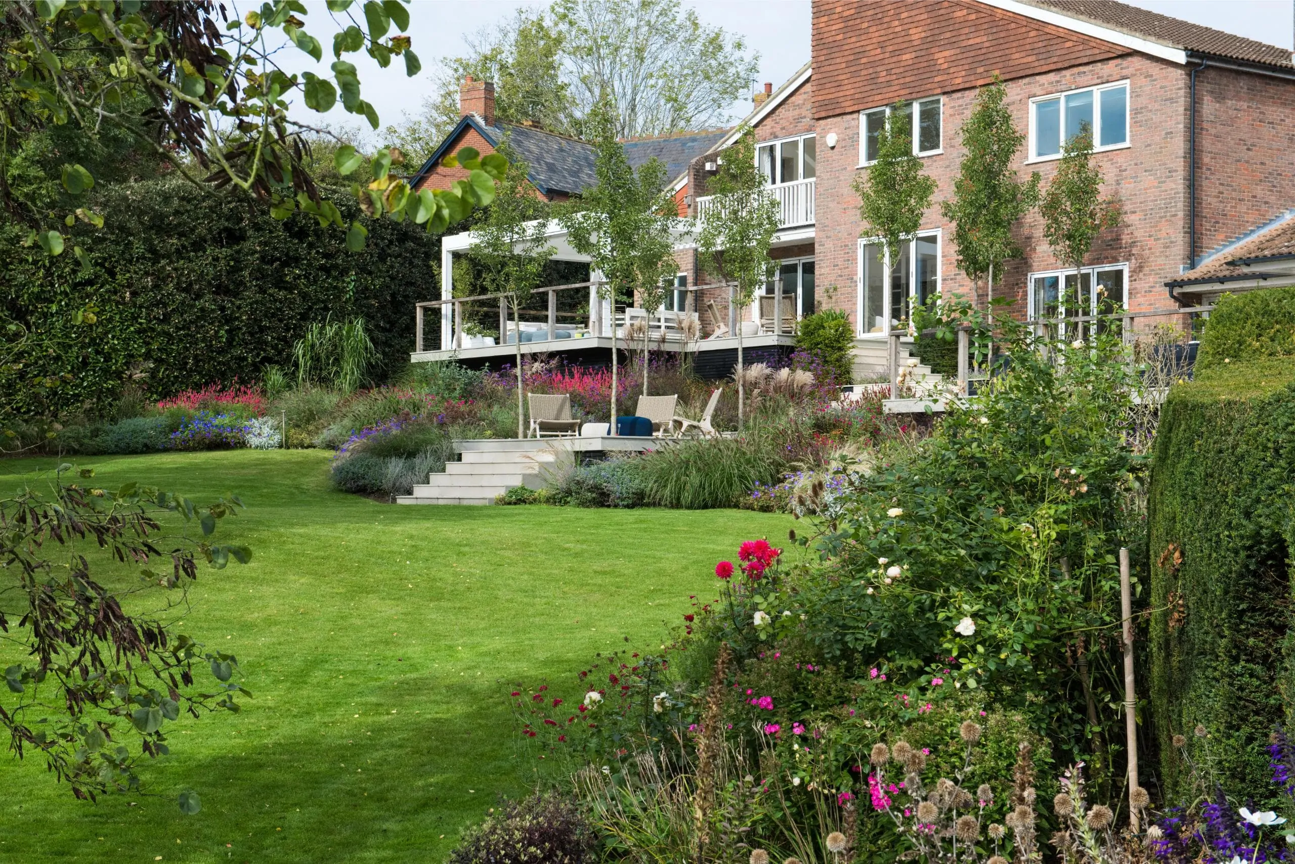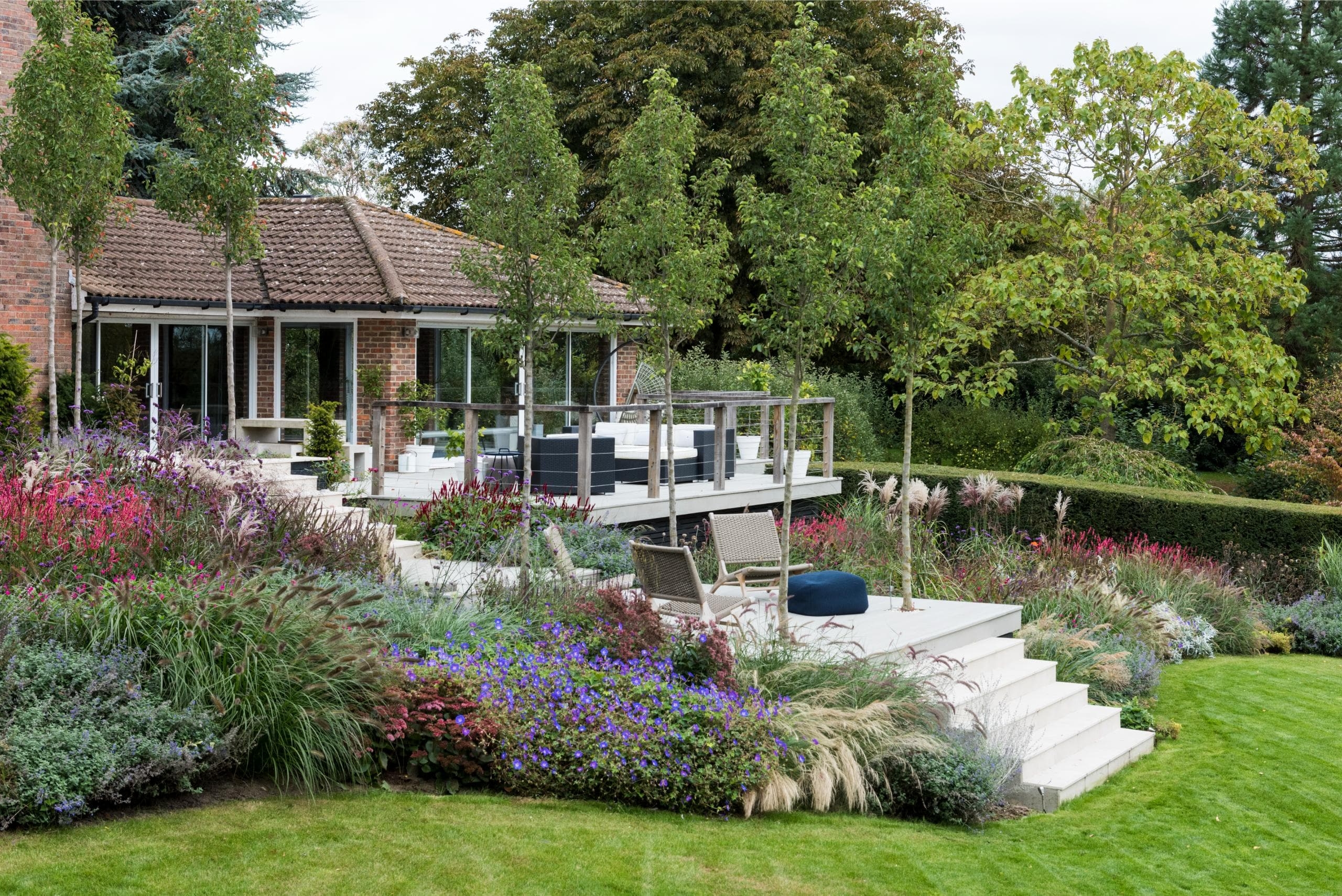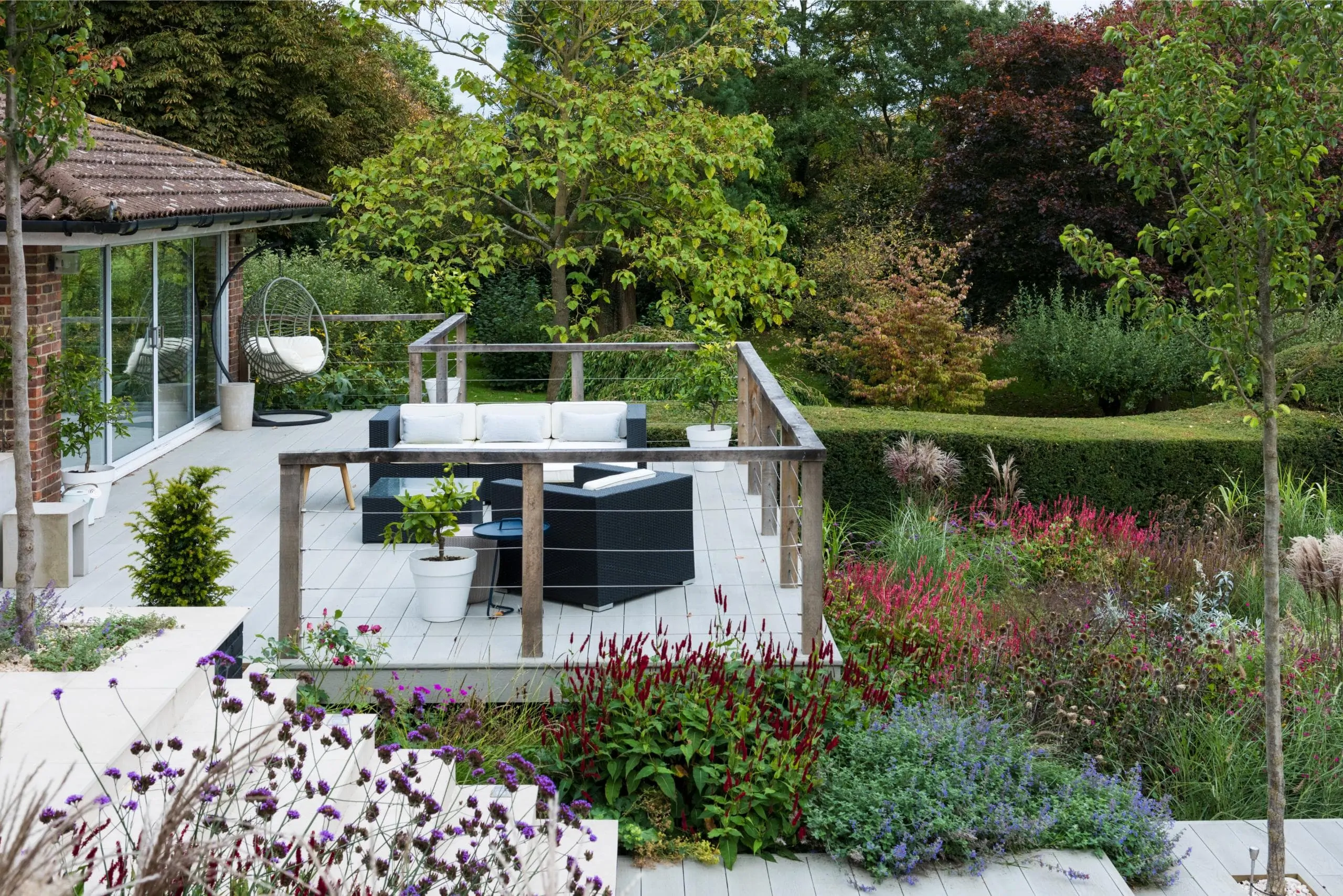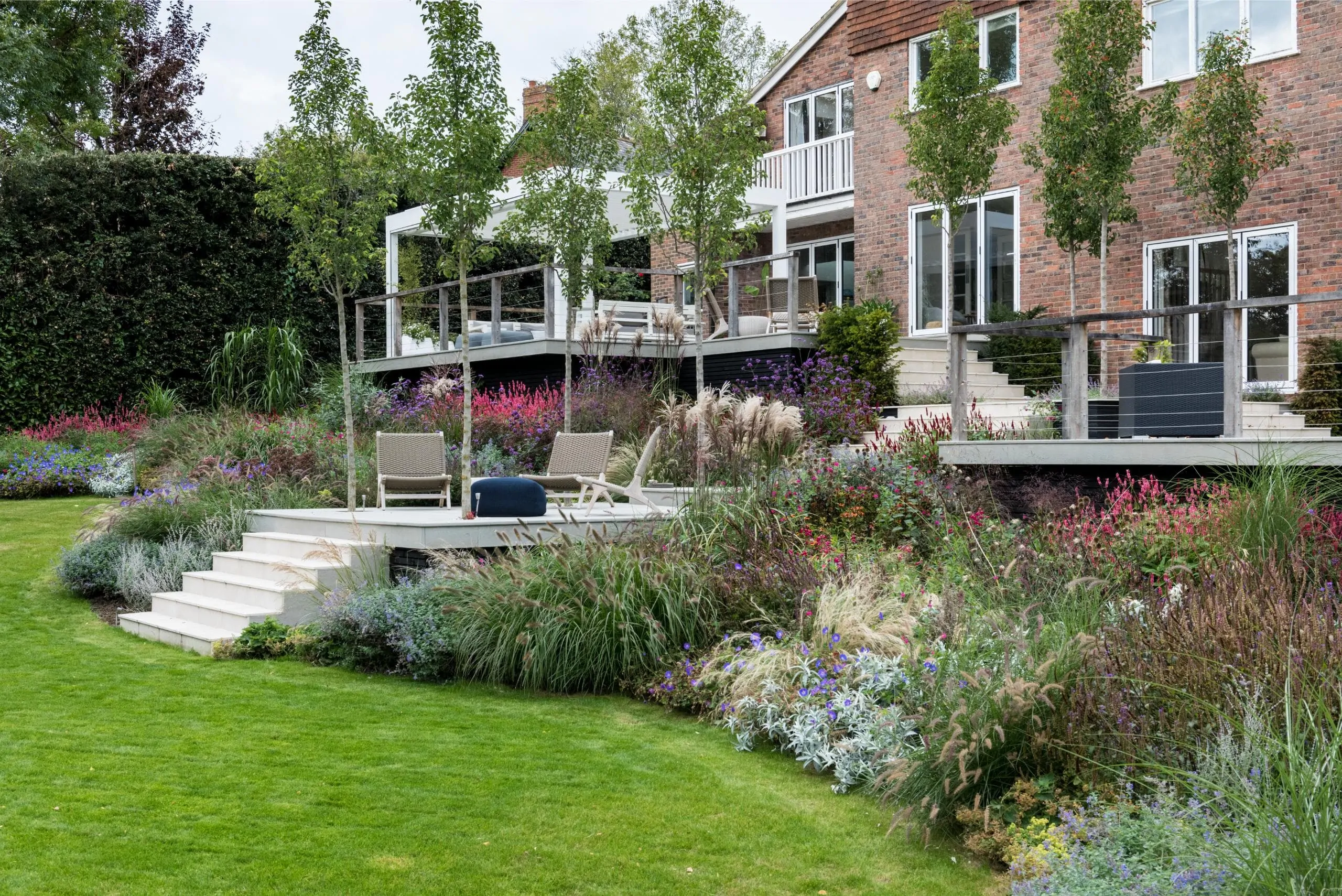 A contemporary garden design in Plaxtol, Kent, transforming a steep, sun-baked slope into layered outdoor spaces that complement a 1970s house.