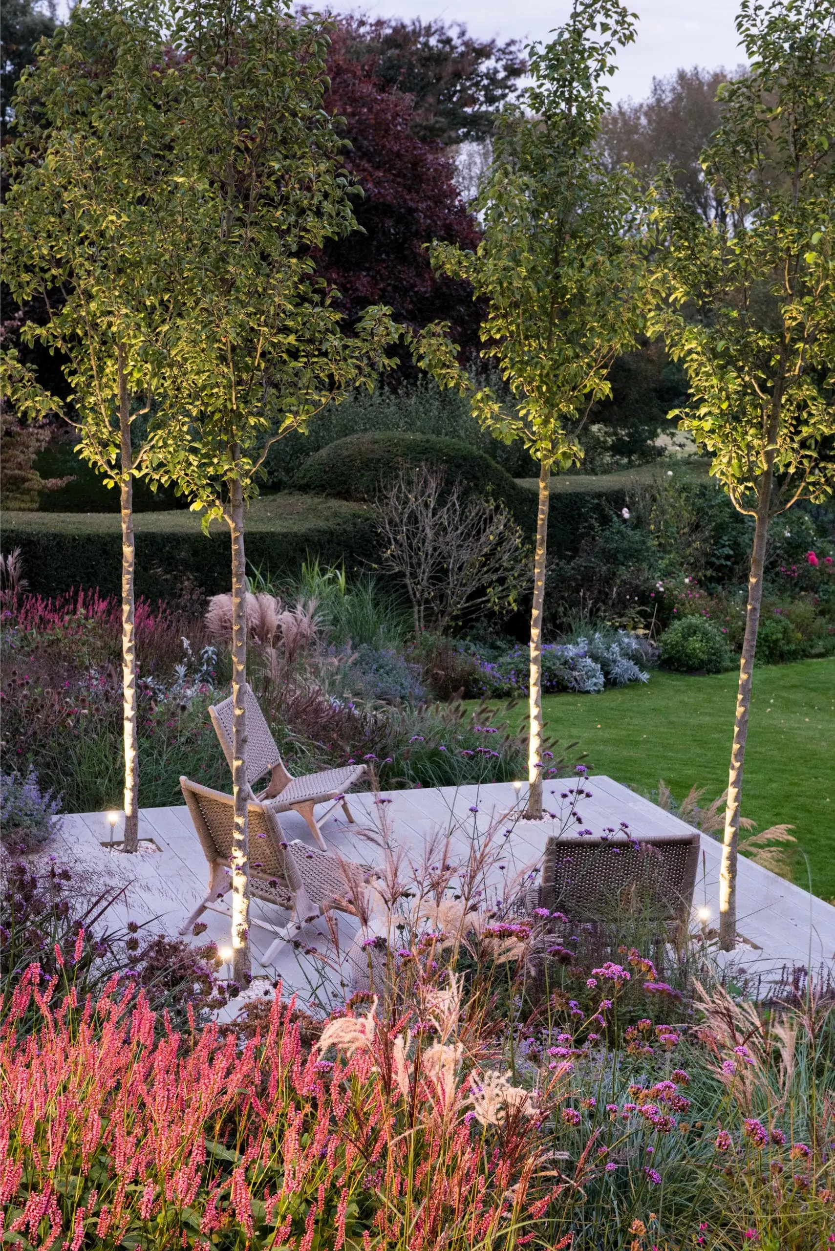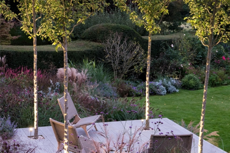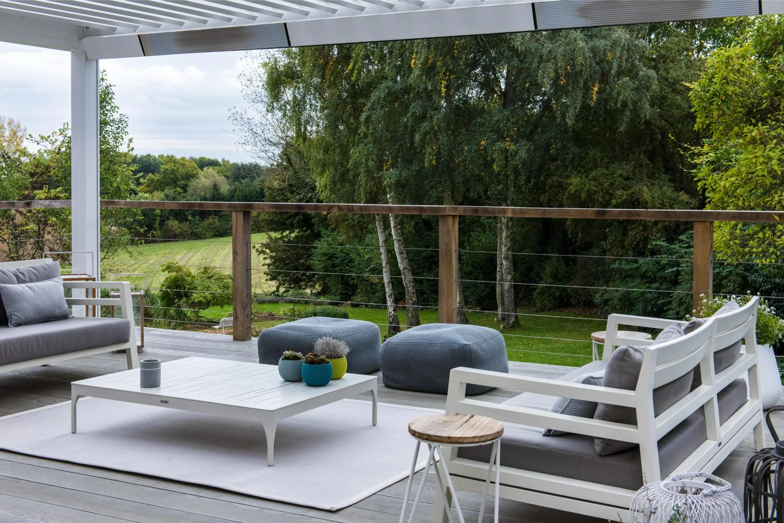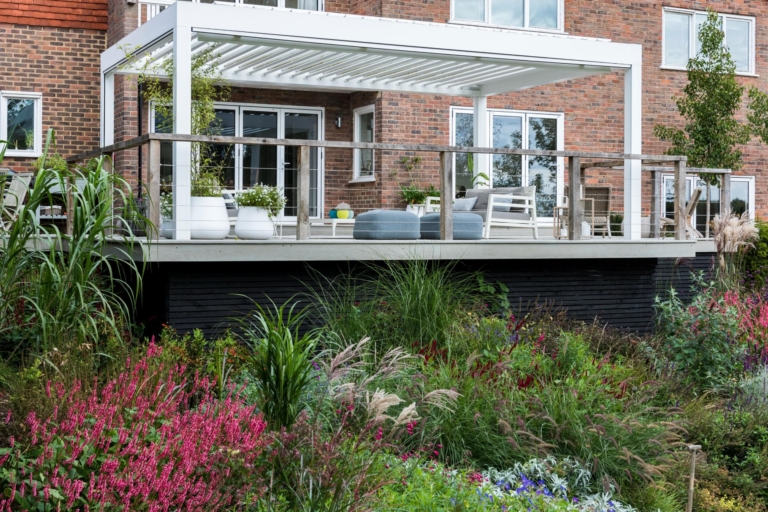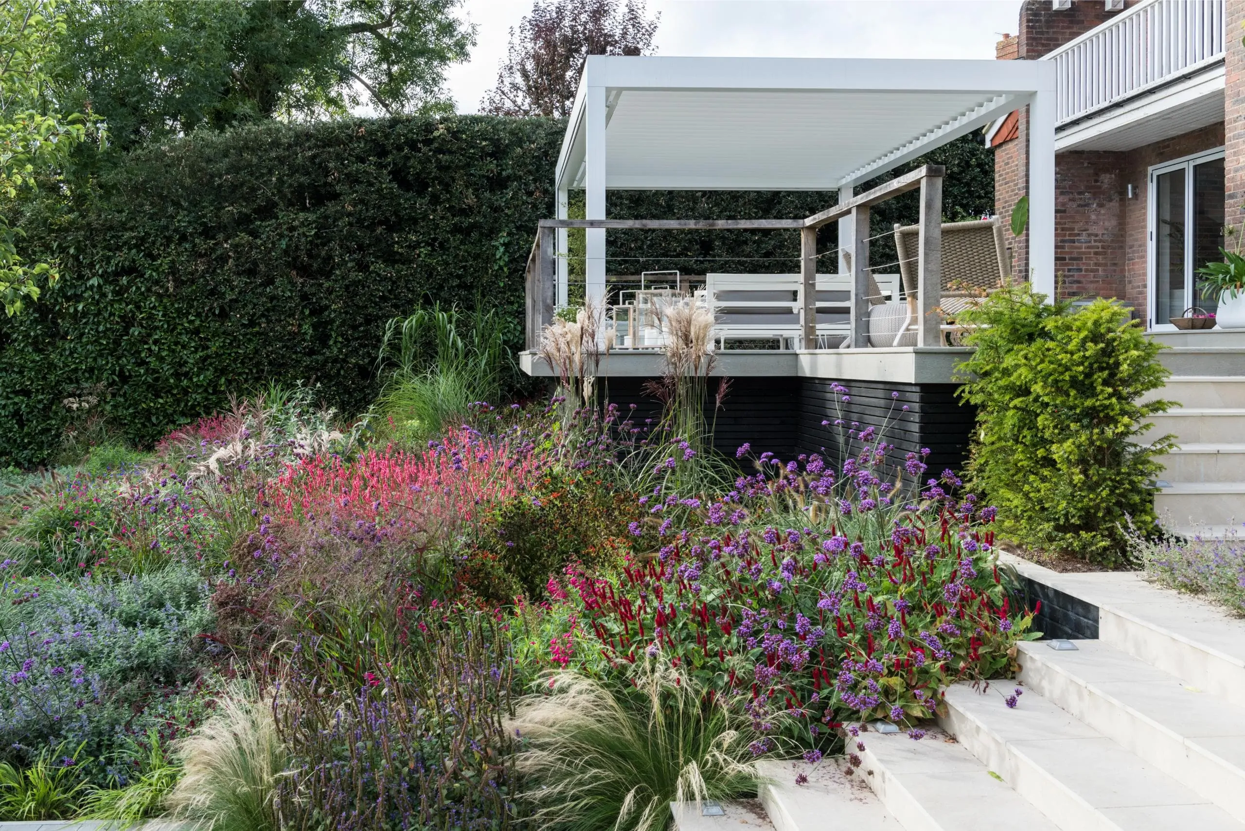 A combination of composite Millboard decking and porcelain paving adds richness and variation to the ground plane, subtly guiding the eye and movement toward the lower lawn. To improve comfort and usability, a louvred canopy by Renson was installed, offering adjustable shade and allowing the garden to be enjoyed throughout the day.