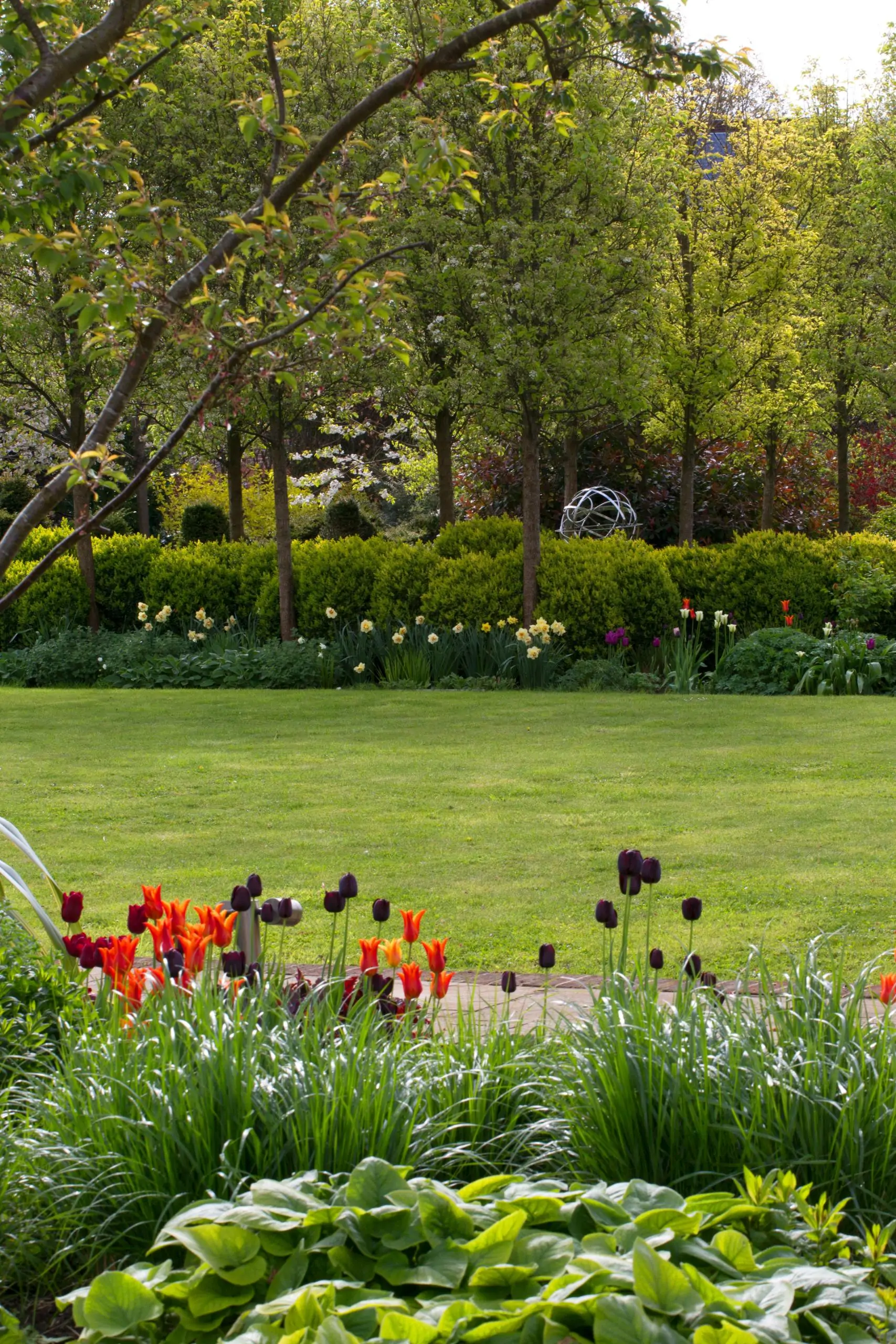 Generous borders of trees, shrubs, and perennials were designed to blur the awkward geometry of the plot, disguising hard angles and reinforcing the feeling of a mature English country garden. As planting develops, the garden continues to settle comfortably into its landscape, complementing the elegance and stature of the house.